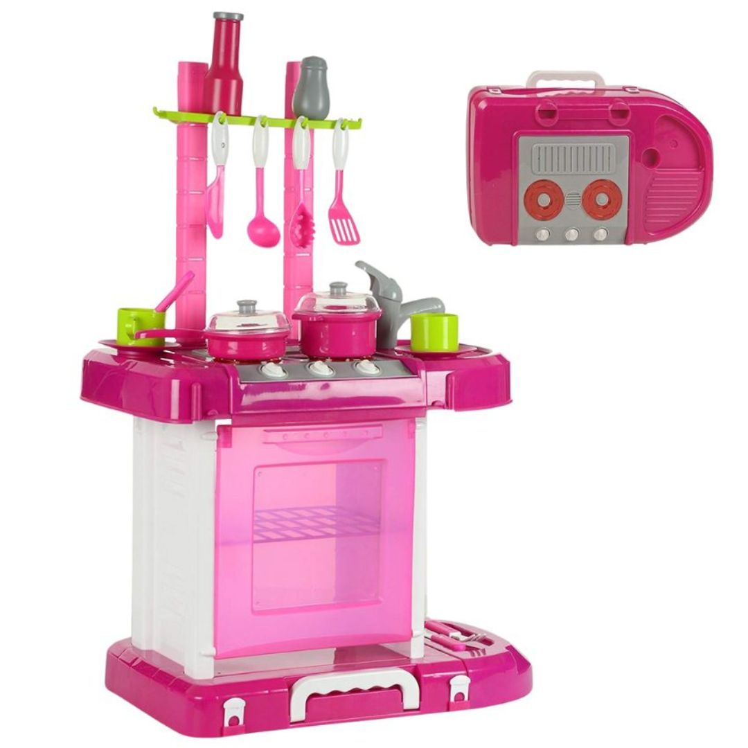 Cocina maleta CARACTERISTICAS Contiene 15 accesorios (ollas, sartenes, utensilios de cocina, comida de juguete y mucho más)Fácil de arma y almacenarContiene sonidos y lucesFuente: 3 Baterias AAA (baterías no incluidas)Medidas: 65.5 cm x 42 cm x 25.5 cm.