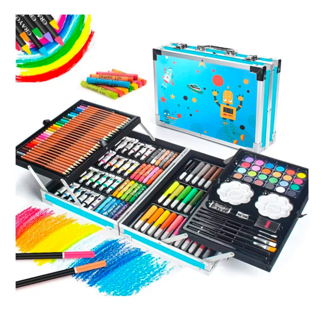 Maletín set de arte de lujo CARACTERISTICAS Set de 145 piezasIncluye cierre de clic. Trae acuarelas, marcadores, lápices de colores, crayones, pinturas, paletas de pinturas, pinceles, lápices, borrador y sacapuntas.Es metálicoCompacto, Fácil de transportarMedidas: 34cm Larg x 23cm Alt x 9cm