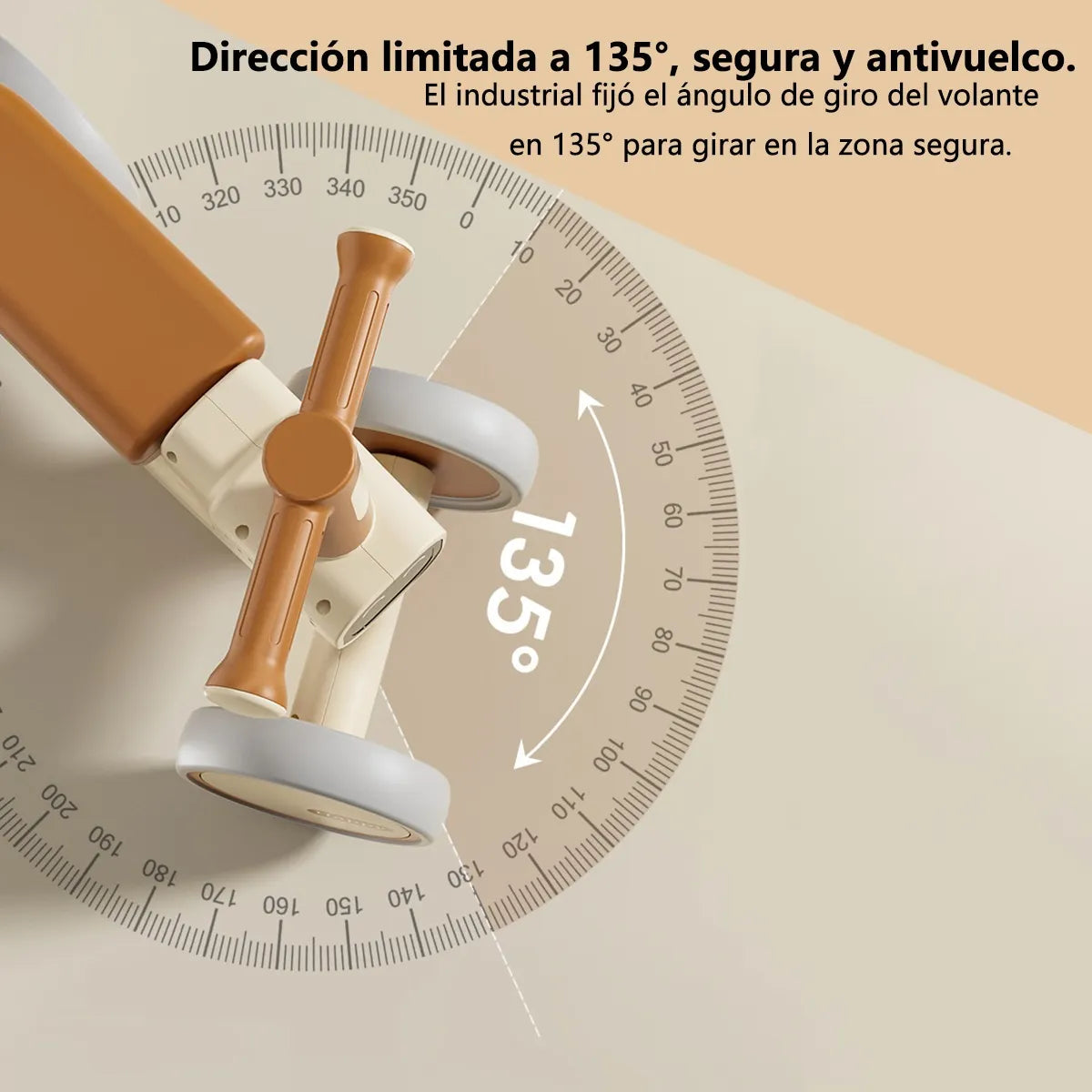 Sistema de dirección con límite de 135° que evita volcadas y mejora la estabilidad durante el uso.